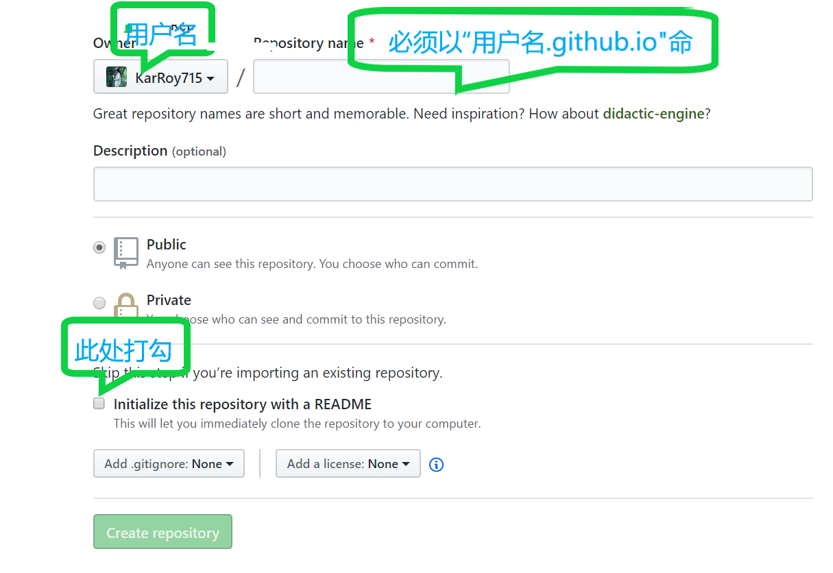 再点击 右上角头像旁边的“+”号,点击New repository 开始创建