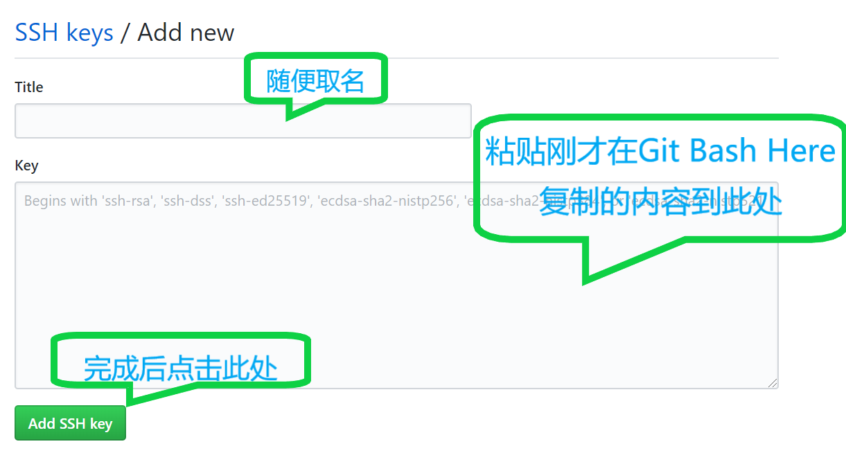 在第一次新建的文件夹下右键点击Git Bash Here,然后输入```cat ~/.ssh/id_rsa.pub```,复制输出的内容,然后粘贴到刚才公钥的地方